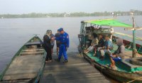 Sampit - Kapal Polisi (KP) XVIII - 2006 Patroli Daerah Aliran Sungai (Das) Mentaya, saat berpatroli menyambangi masyarakat khususnya Desa Bapinang hilir, Kec. Pulau Hanaut, Kab. Kotawaringin timur, meminta masyarakat untuk terus meningkatkan mitigasi bencana alam mengingat curah hujan dan angin cukup kencang, Jumat (24/11/2023) siang.
